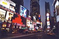 Square. Riesige Leuchtreklamen und Bildschirme tauchen die blaue Stunde in
